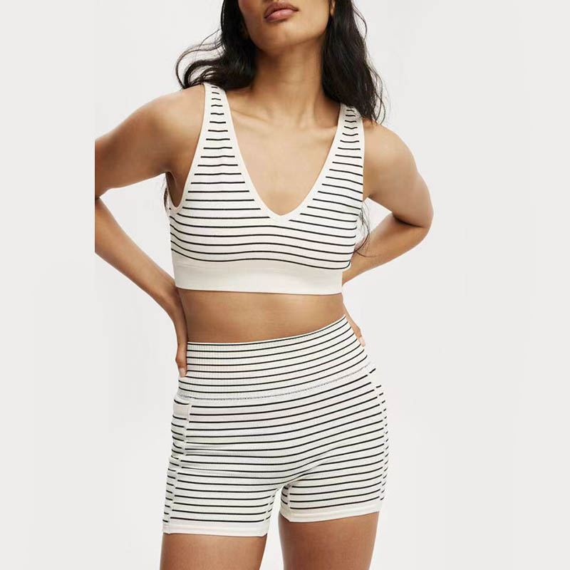 Једна од истакнутих карактеристика овог спортског грудњака је његов пругасти дизајн. Пруге додају дашак стила и тренди овом функционалном топу. Овај женски спортски грудњак са бешавним пругама је савршен за било коју фитнес рутину, било да клијент диже тегове, ради јогу или трчање. Његова чврста конструкција омогућава купцима да се слободно крећу без бриге о клизању или прилагођавању грудњака. Могу да остану фокусирани и концентрисани на тренинг без икаквих ометања. Нудимо бесплатне узорке, тако да можете тестирати производ пре него што га наручите.
